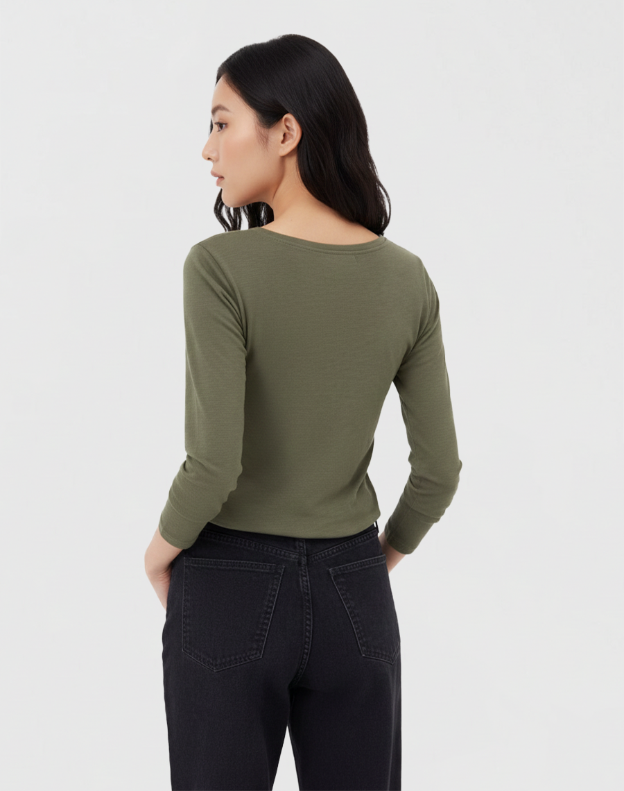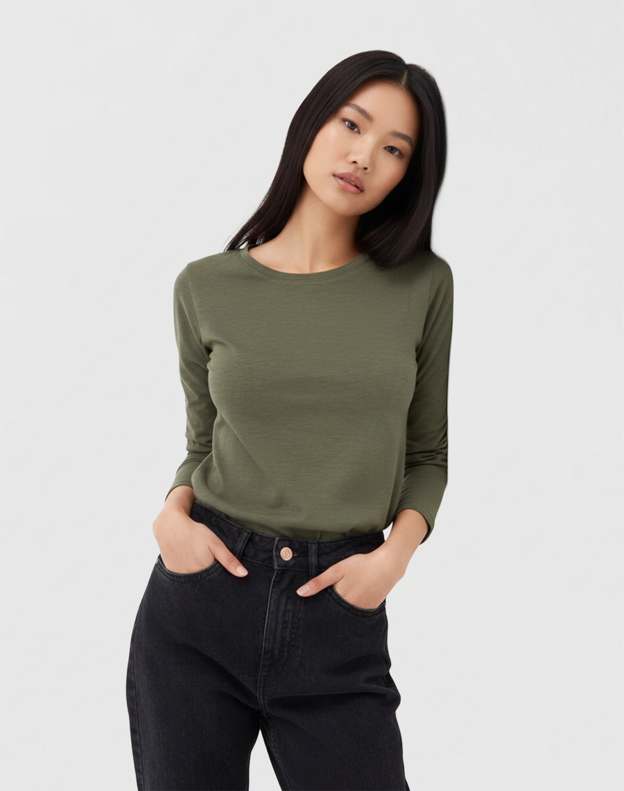Available in a classic olive green (as shown) and other essential colors, it’s incredibly easy to style. Wear it solo with jeans for a relaxed look, layer it under a cardigan or jacket for added warmth, or tuck it into a skirt for a more polished ensemble. The Crew Neck Long-Sleeve T-Shirt is the quintessential wardrobe workhorse, proving that comfort and style can seamlessly coexist.